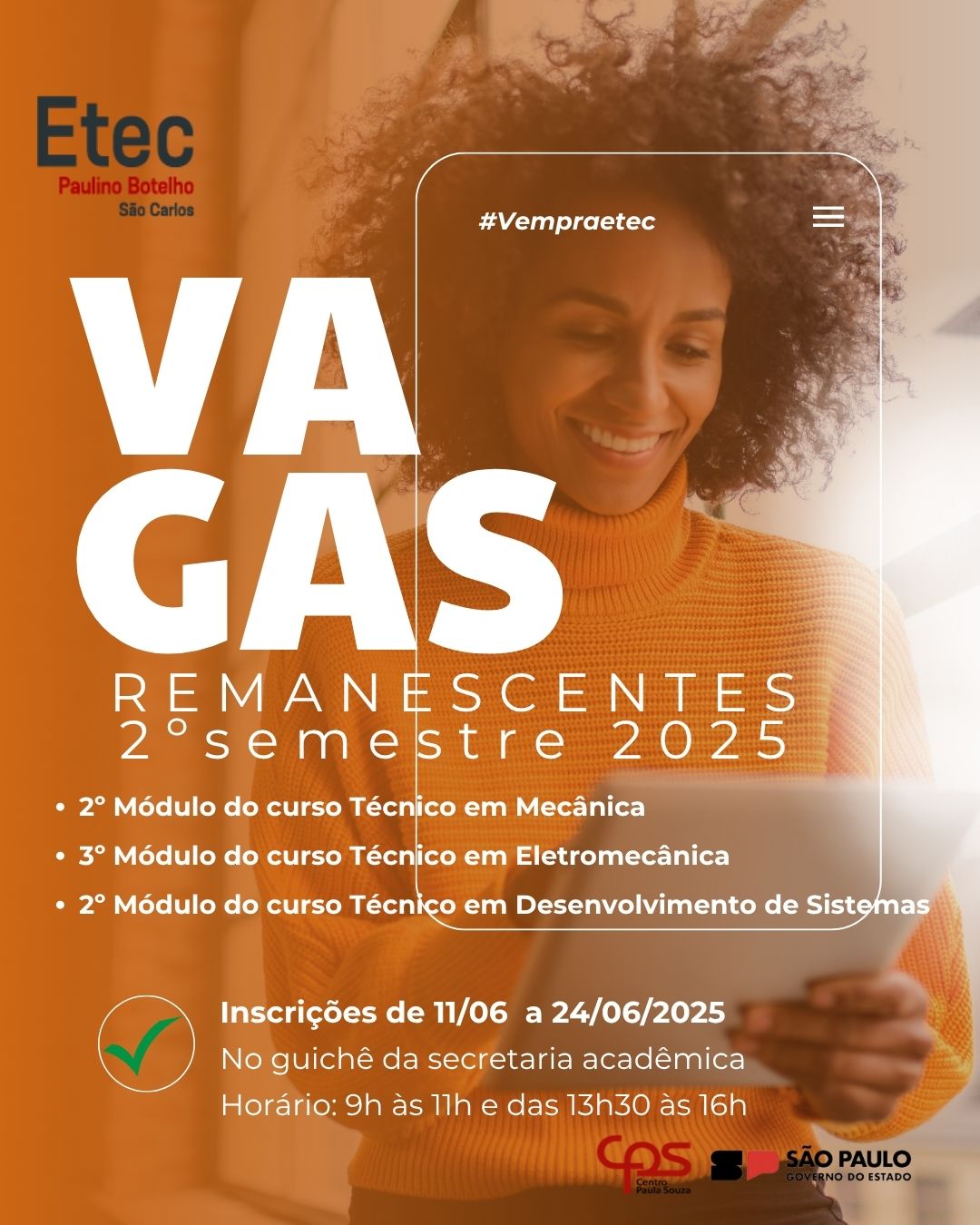 Em breve iniciarão as inscrições para vagas remanescentes dos cursos técnicos da ETEC Paulino Botelho!📌 Consideram-se vagas remanescentes aquelas oriundas de transferência, retenção e desistência de alunos. 🎓 Cursos com vagas disponíveis: 2º Módulo do […]