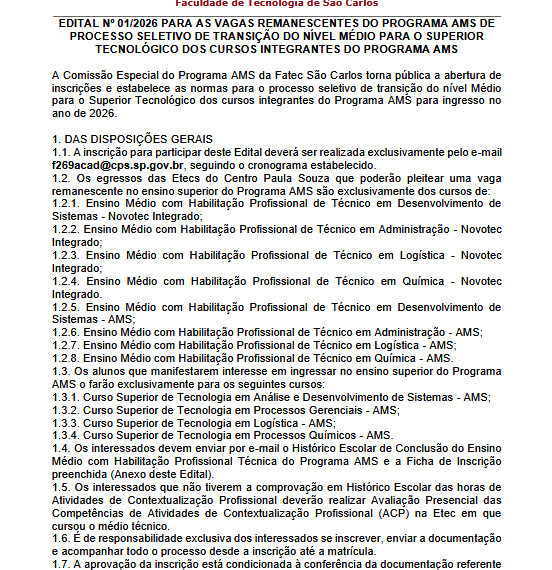 A Fatec São Carlos abriu inscrições para o processo seletivo de Vagas Remanescentes no Ensino Superior Tecnológico, no âmbito do Programa AMS, para ingresso em 2026!